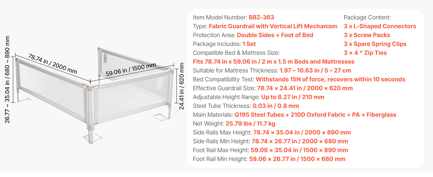 | Side Rails Max Height | 78.74 x 35.04 in / 2000 x 890 mm |
