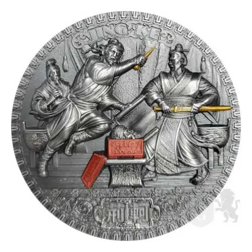 The reverse depicts Jing Ke's attack on King Qin. The weapons of both heroes have been selectively plated in gold. A 3D insert in the form of a box containing Fu Yugi's head has been placed in the central part of the coin.